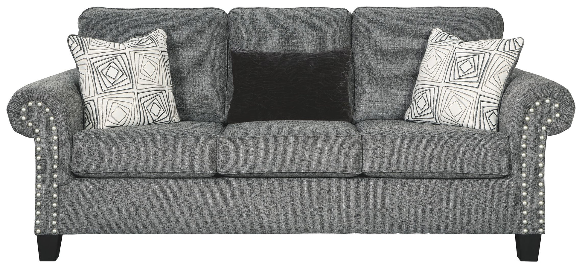 A contemporary dream. This sofa checks off everything on your list. Designer profile is accentuated with roll arms and pewter-tone finished nailhead trim. Upholstered in a textured chenille, the feel is up to par with the look. Geometric throw pillows flaunt a mesmerizing pattern. Black jacquard faux fur kidney pillow fluffs up the luxury factor. Tapered accent legs finish off top-to-bottom style.