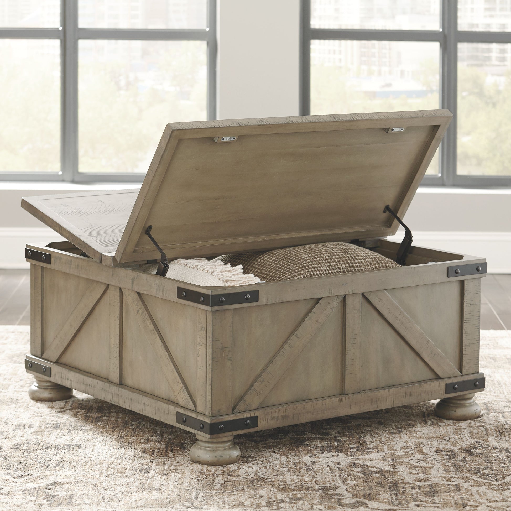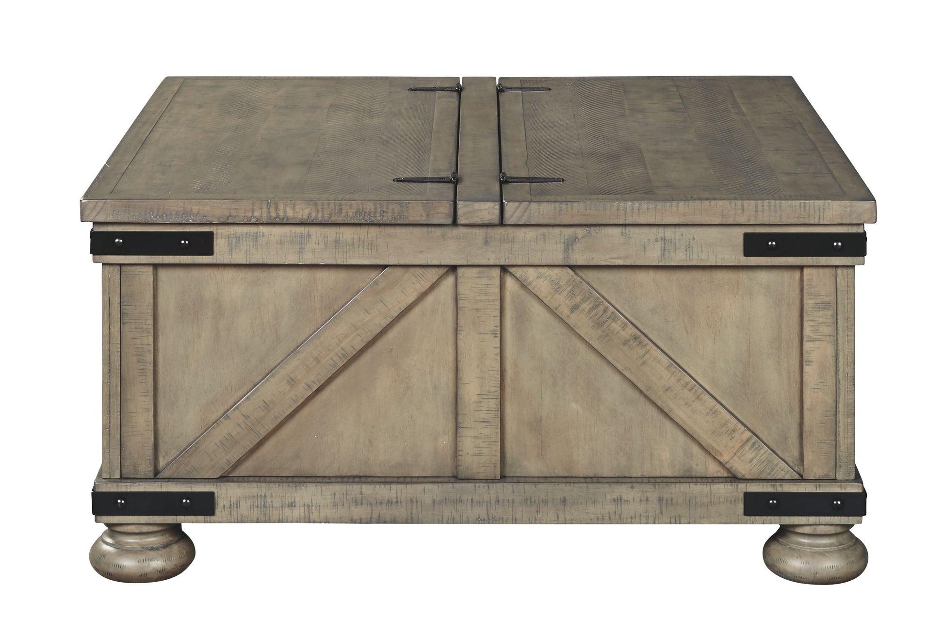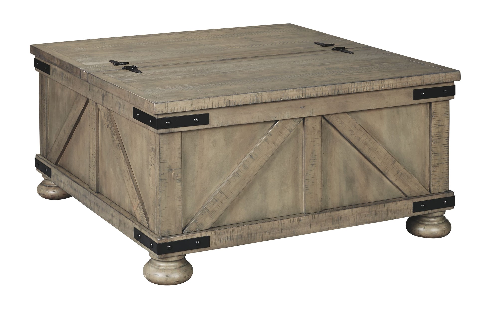 Double up on form and function with this square coffee table with storage. Its dual lid tabletop provides easy access to the roomy storage space. Crafted with solid pine wood treated to a weathered gray finish, this generously scaled coffee table is rustic farmhouse living at its best.