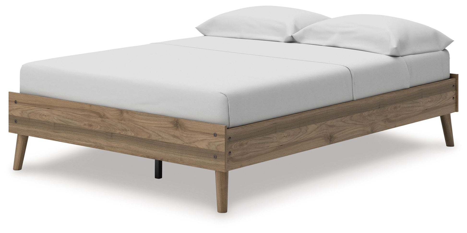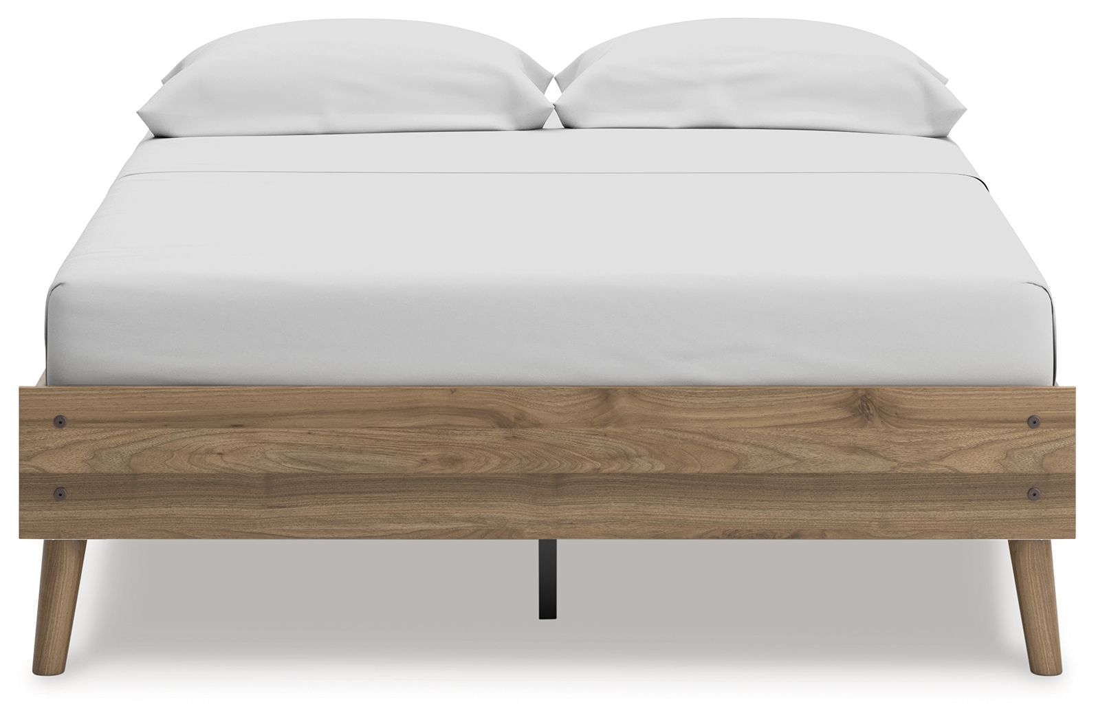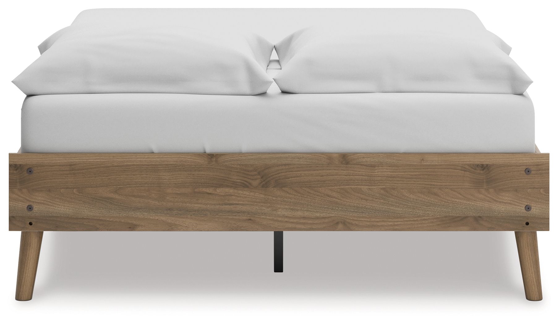 Dare to take minimalism to the max. This platform bed has an air of sleek simplicity thanks to its painted finish with subtle replicated wood grain. Magnificently mod splay legs are a compelling complement to the streamlined design. There's no doubt about it: This contemporary piece is sure to become a classic