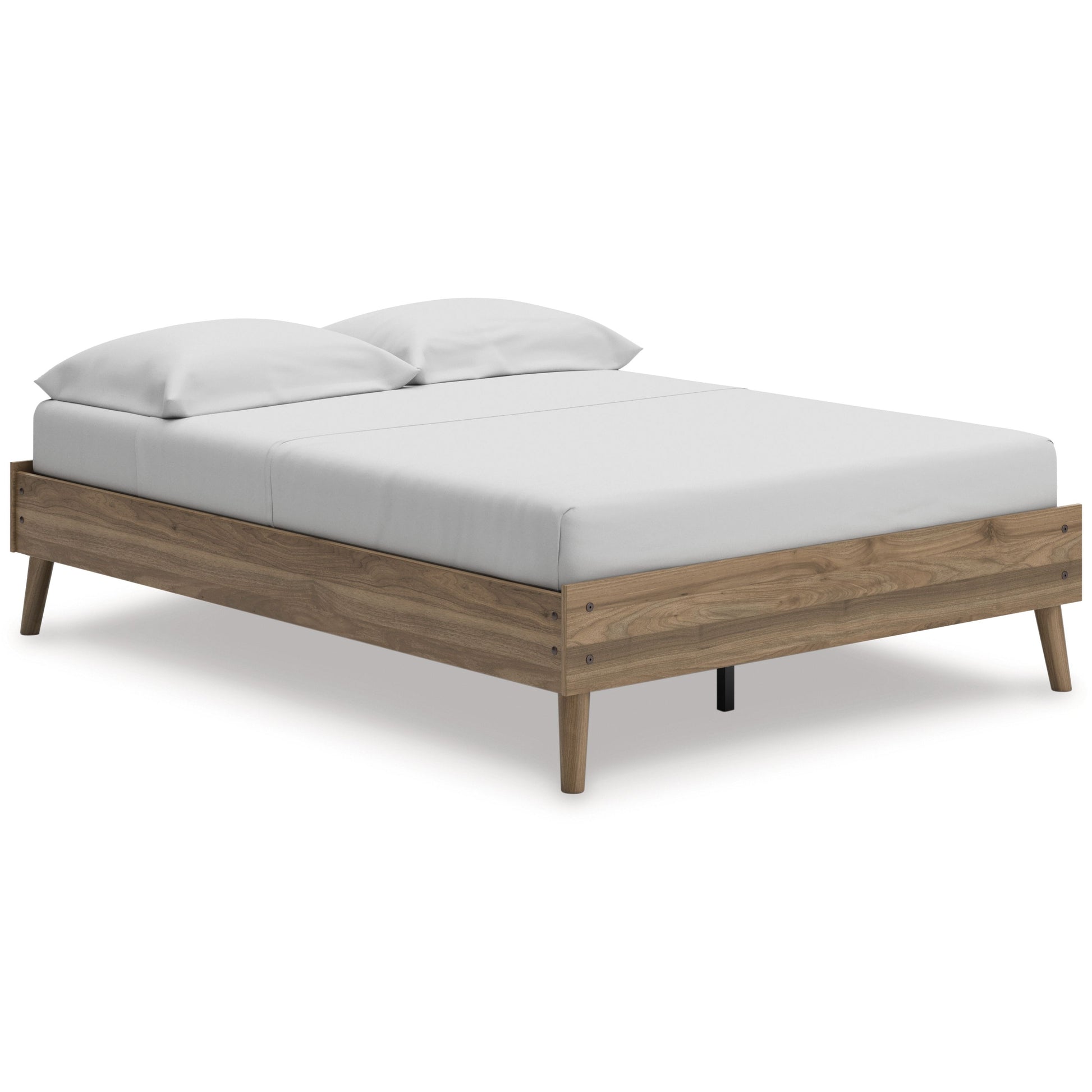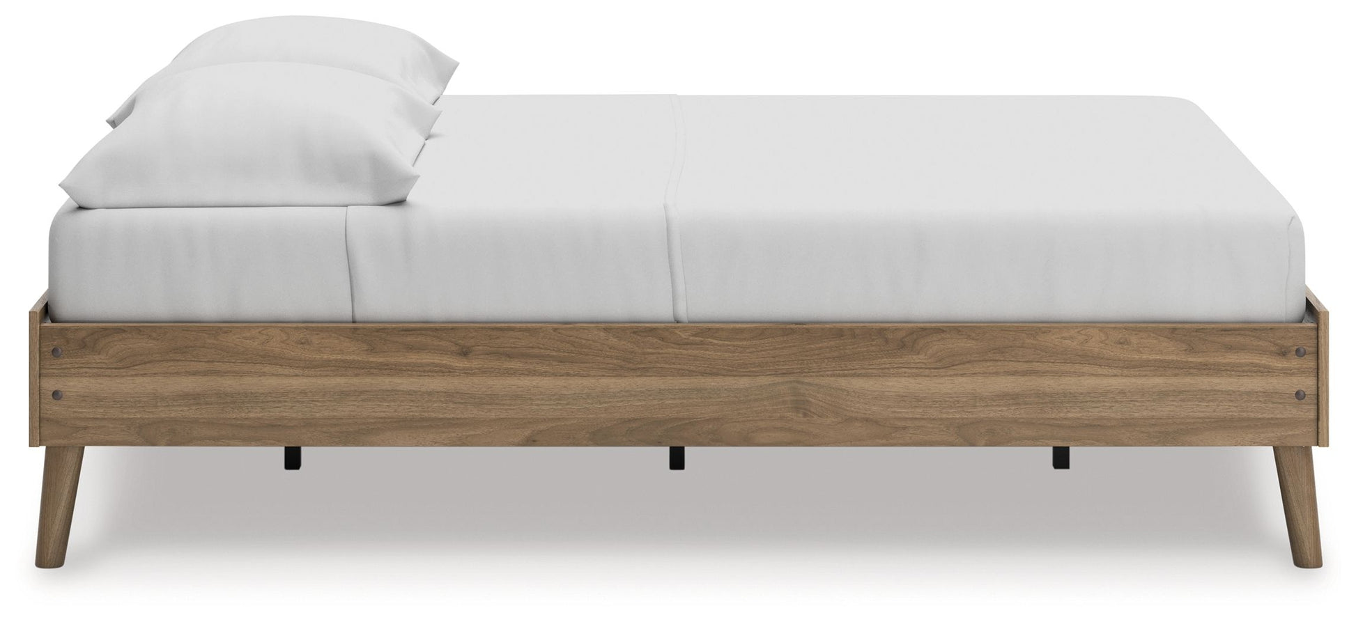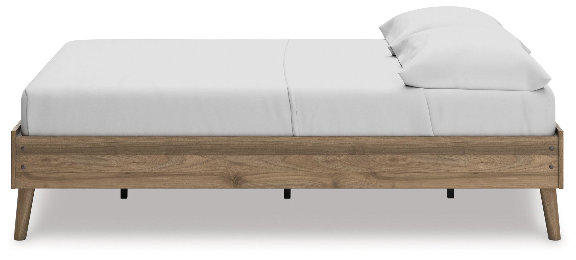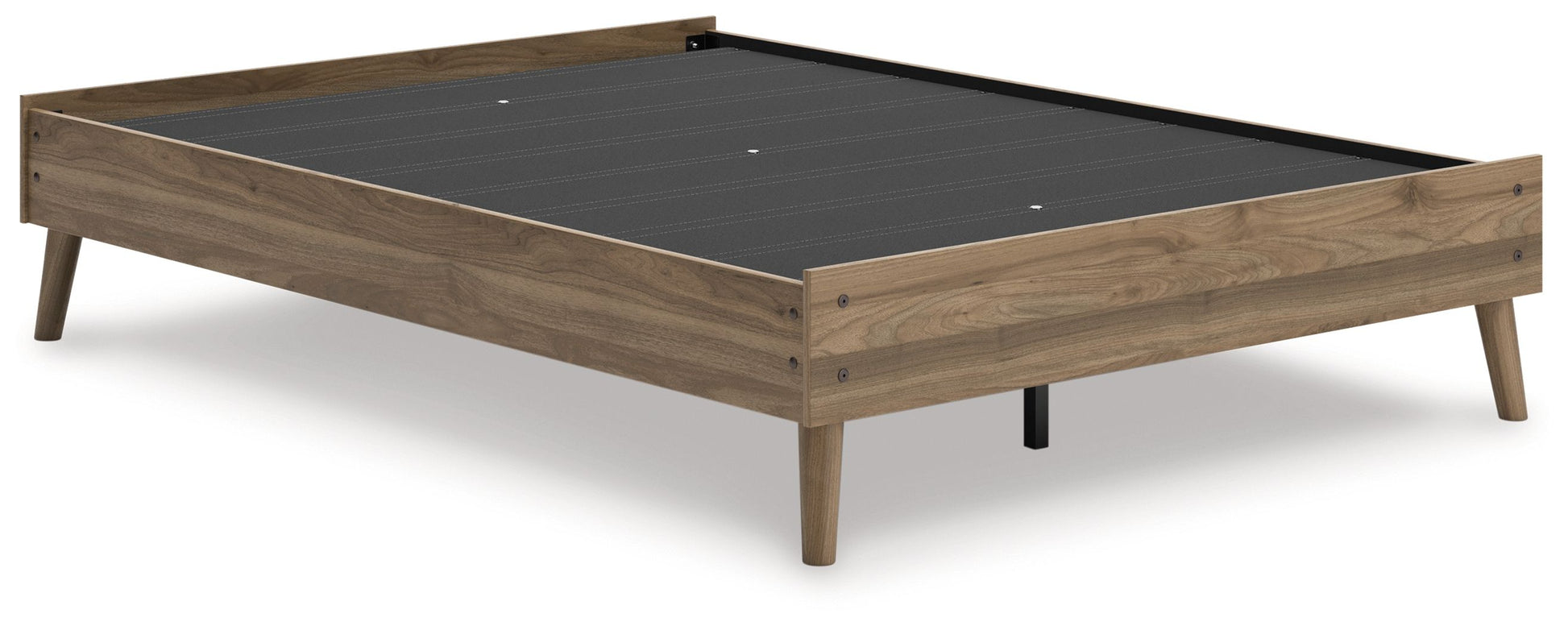 Dare to take minimalism to the max. This platform bed has an air of sleek simplicity thanks to its painted finish with subtle replicated wood grain. Magnificently mod splay legs are a compelling complement to the streamlined design. There's no doubt about it: This contemporary piece is sure to become a classic
