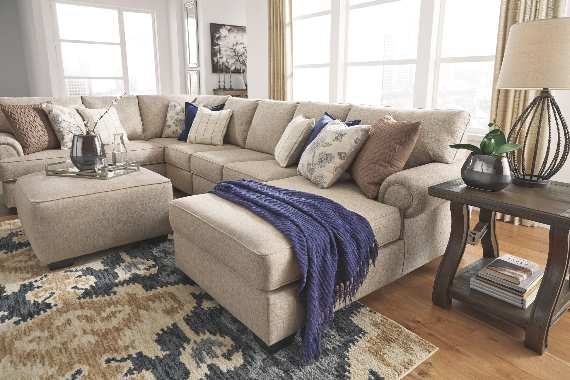 This generously scaled ottoman makes high style look effortlessly elegant. Textured linen-weave upholstery is warm, neutral and a natural complement for any space. Tri-block feet in a dark finish add a nice contrast and tailored touch.