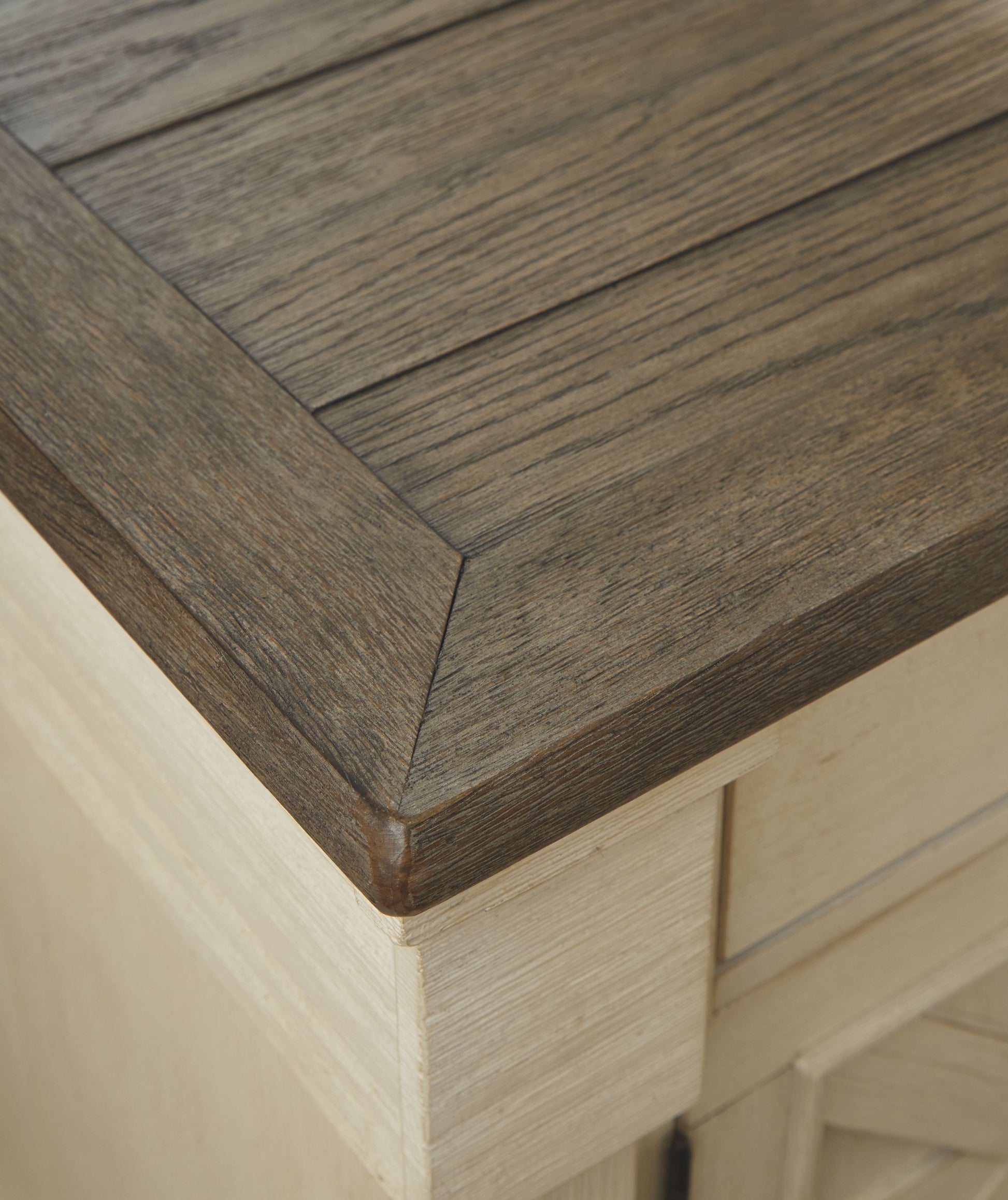 Whether your style is farmhouse fresh, shabby chic or country cottage, you’ll find this nightstand dressed to impress. Its two-tone, gently distressed finish pairs weathered oak with antique white for that much more quaint character. Elements include a crossbuck adorned storage cabinet, felt-lined drawer with dovetail construction and pair of power outlets and USB charging ports for added convenience.
