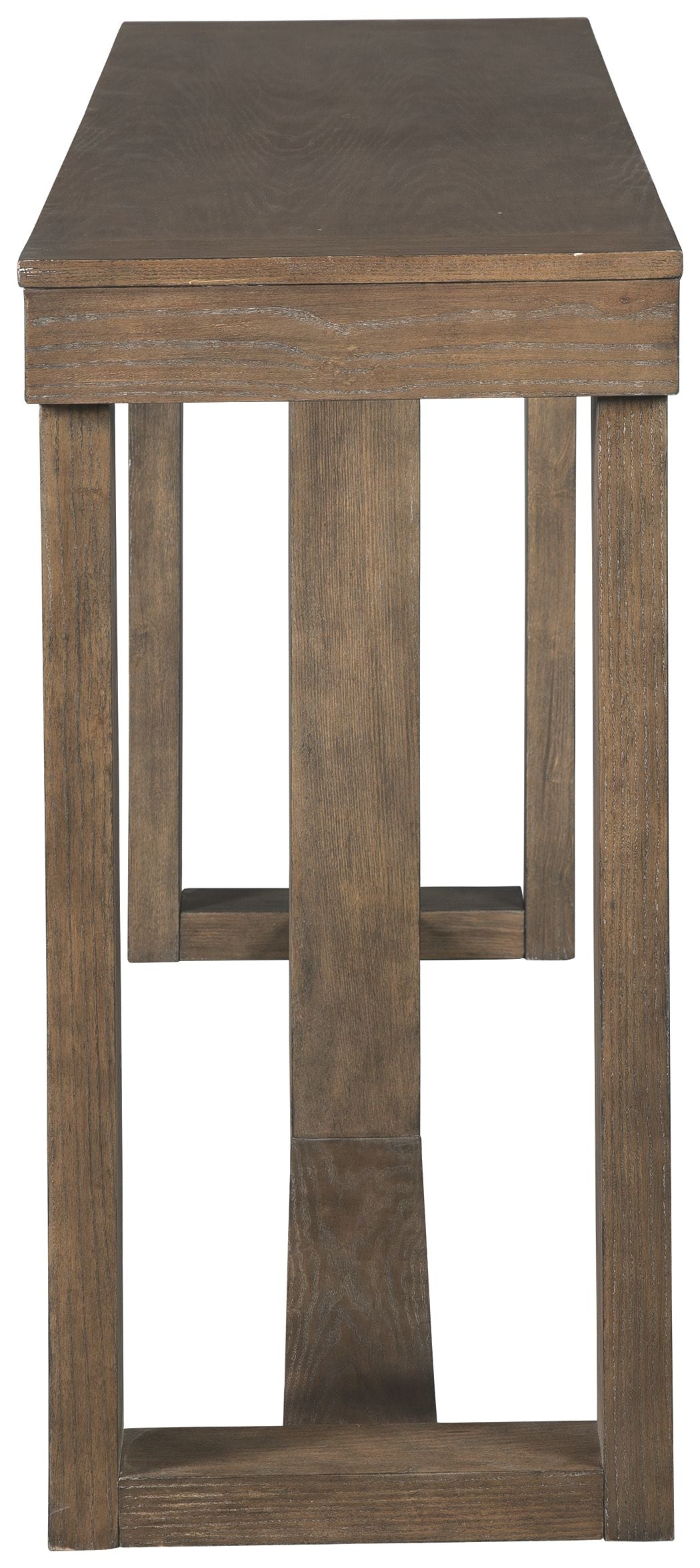 This designer sofa table masters the art of simplicity. Bold, blocky profile is enriched with plank-effect styling and a textured grayish brown finish for a look that’s cool and contemporary and a vibe that’s warm and inviting.