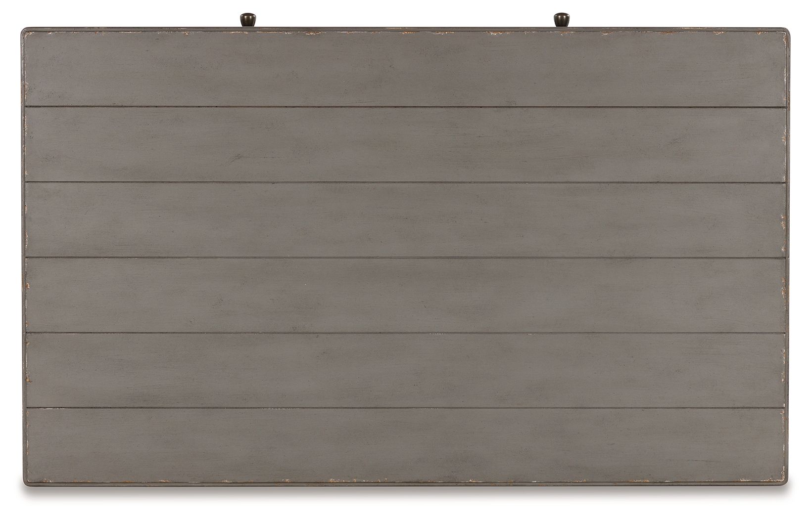 Put your love of European farmhouse styling on display. Finished with an antiqued gray chipped paint effect for an authentic vintage look, this coffee table is loaded with character. Two drawers and an open display shelf allow for storage and easy access to books, beverages and more.