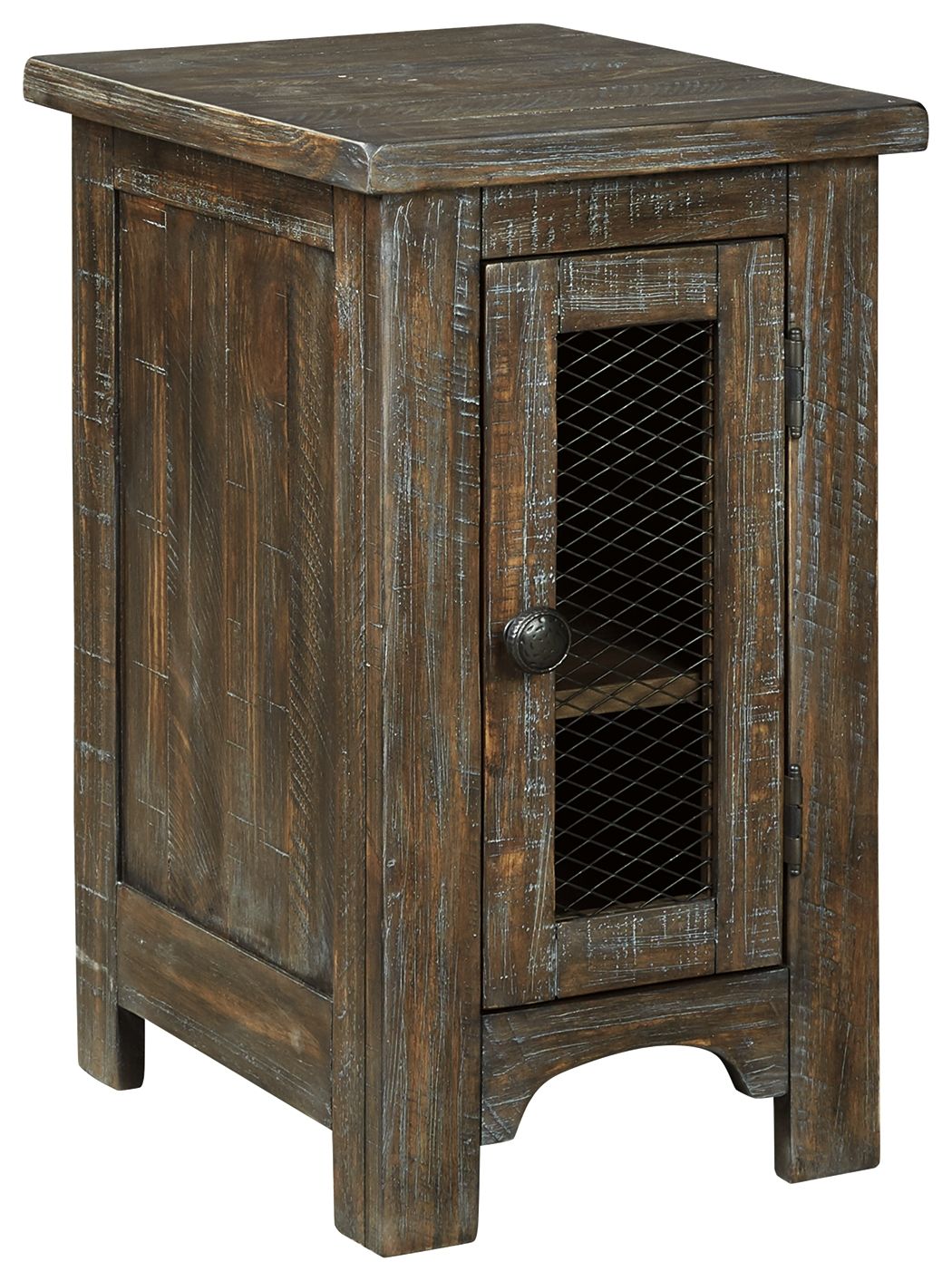 This chairside end table is so much better for the wear. Its clean, straightforward profile is enriched with solid pine wood treated to a complex finish melding gray and brown hues. Cabinet door with wire mesh front infuses a farmhouse fresh element that’s right on trend. Talk about loaded with charm and packed with possibilities.