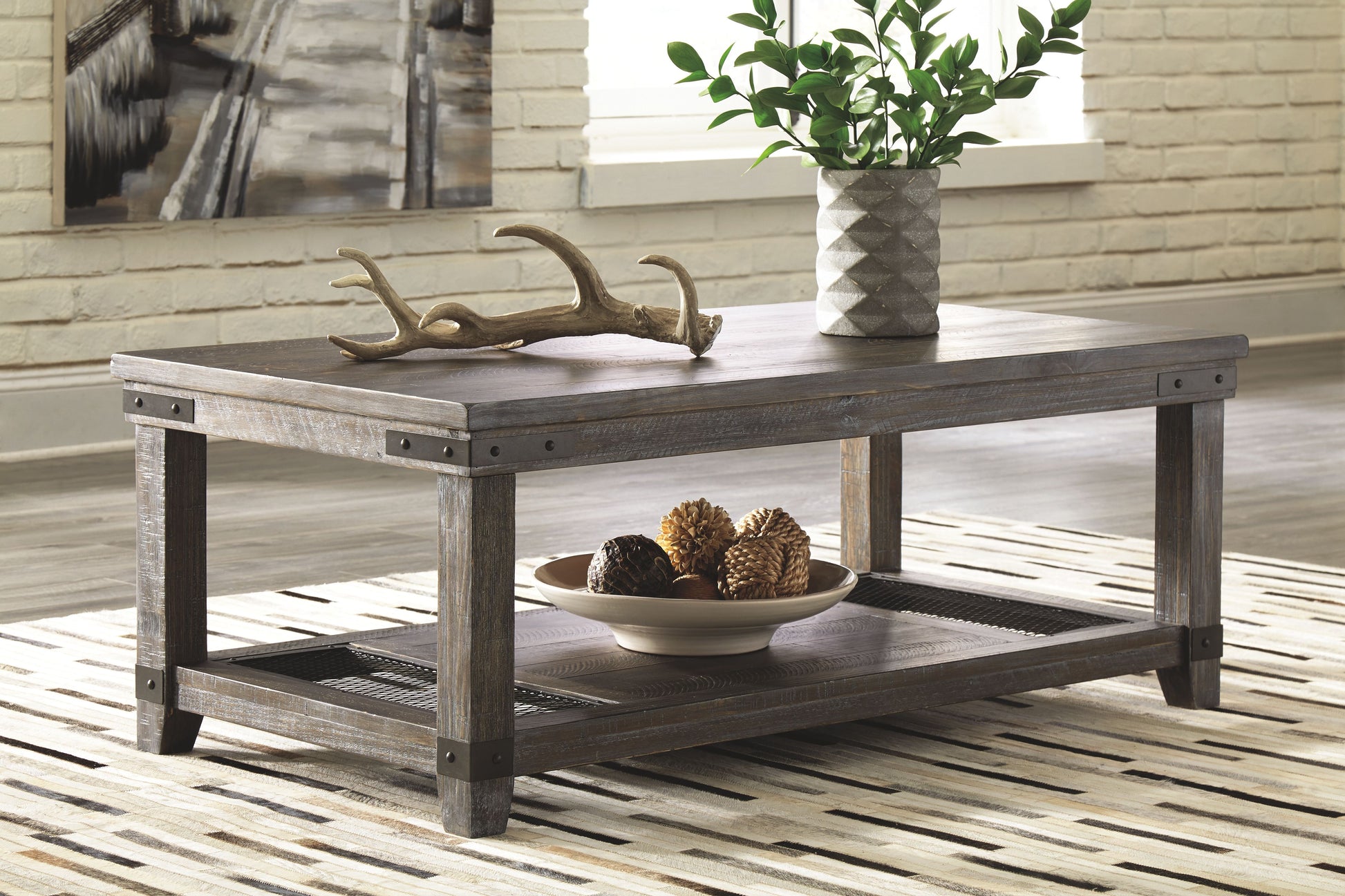 This coffee table is so much better for the wear. Its clean, straightforward profile is enriched with solid pine wood treated to a complex finish melding gray and brown hues. Sporting iron-tone industrial brackets and a distinctive display shelf, it’s loaded with charm and packed with possibilities.