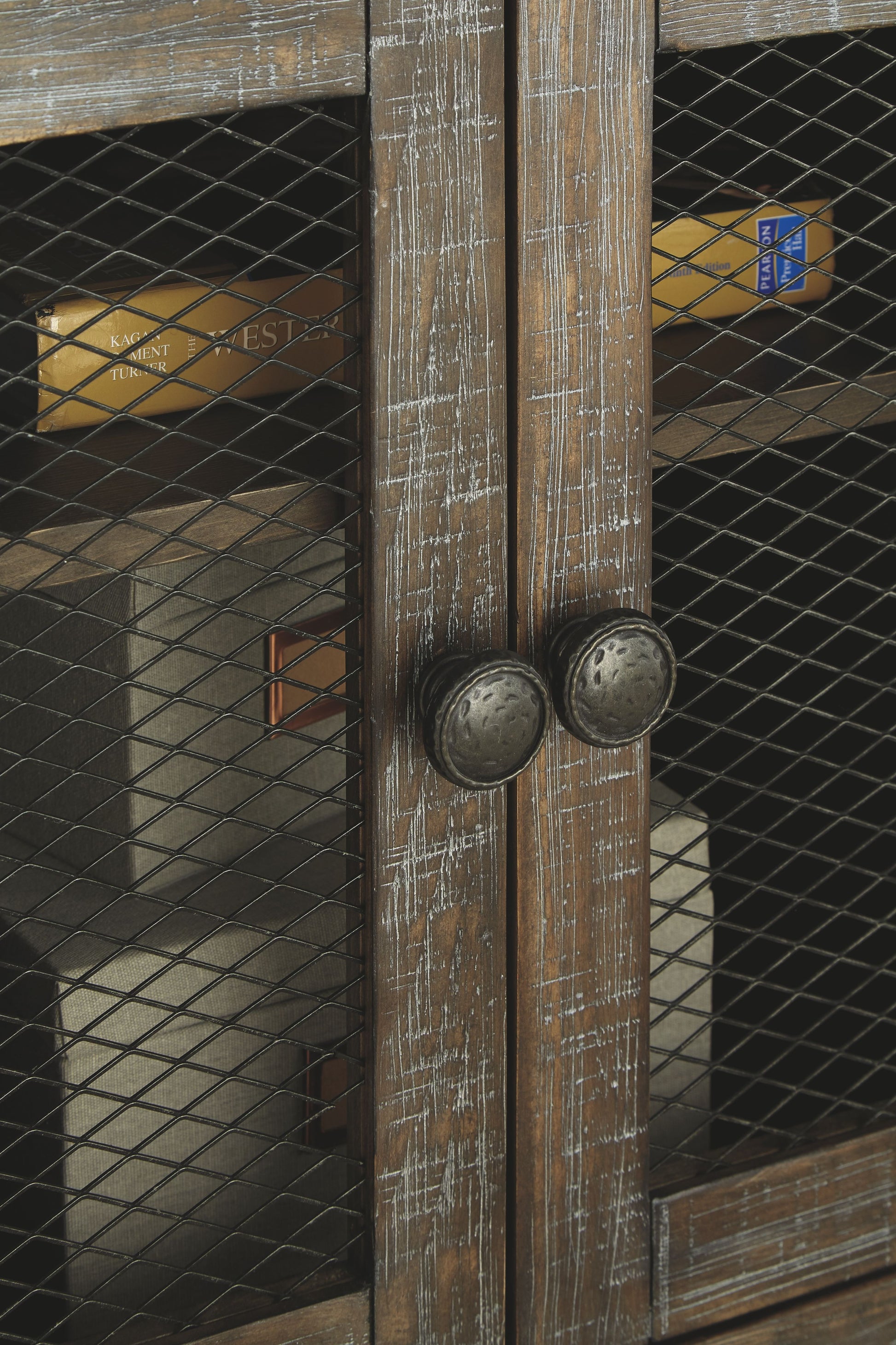 - Double cabinet doors with inset wire mesh revealing single-shelf storage