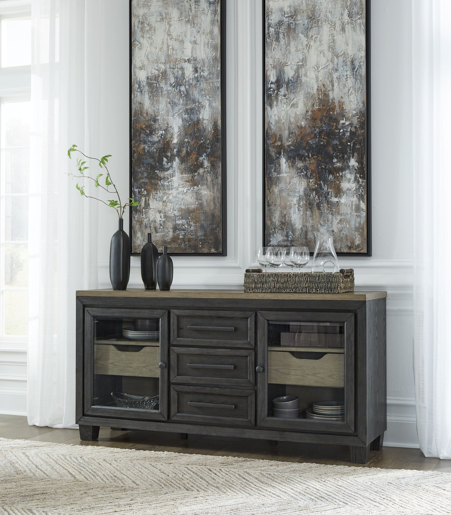 This dining room server is casual contemporary style simply done right. Its two-tone color scheme features rich brushed black main color accented with a beautiful dusty grayish brown wood tone. The versatile piece features three center drawers and two more tucked neatly behind the doors, offering plenty of space to serve your storage needs with ease.