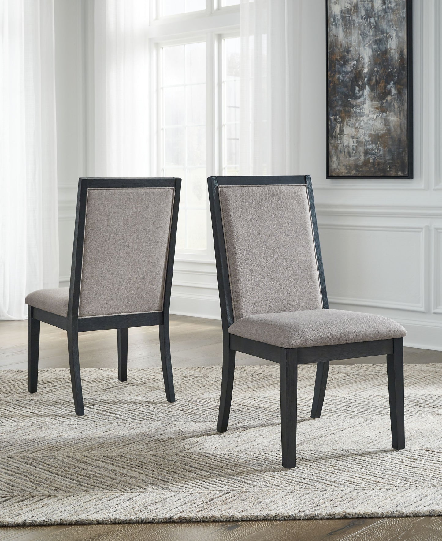 This dining room group's casual contemporary style is simply done right. Its two-tone color scheme features a rich brushed black main color accented with a beautiful dusty grayish brown wood tone and the chairs are stylish and offer a comfortable seat with tightly woven light gray fabric, encouraging guests to linger longer at the table. The server is versatile and features three center drawers and two more tucked neatly behind the doors offering plenty of storage. The table's contemporary trestle base design offers steady support for the rectangular top. This group encourages guests to gather about. Casual contemporary styling. Made with select oak veneers and hardwood solids. Two-tone color scheme featuring a rich brushed black main color accented with a beautiful dusty gray brown wood tone. The dining table boasts a contemporary trestle base design. A stylish wood framed upholstered dining chair offers a comfortable seat with its tightly woven light gray colored fabric. A versatile buffet offers multiple storage solutions with three center drawers and two more tucked neatly behind the doors. Each drawer features dovetailed construction, fully finished interiors and soft-closing ball bearing side glides.