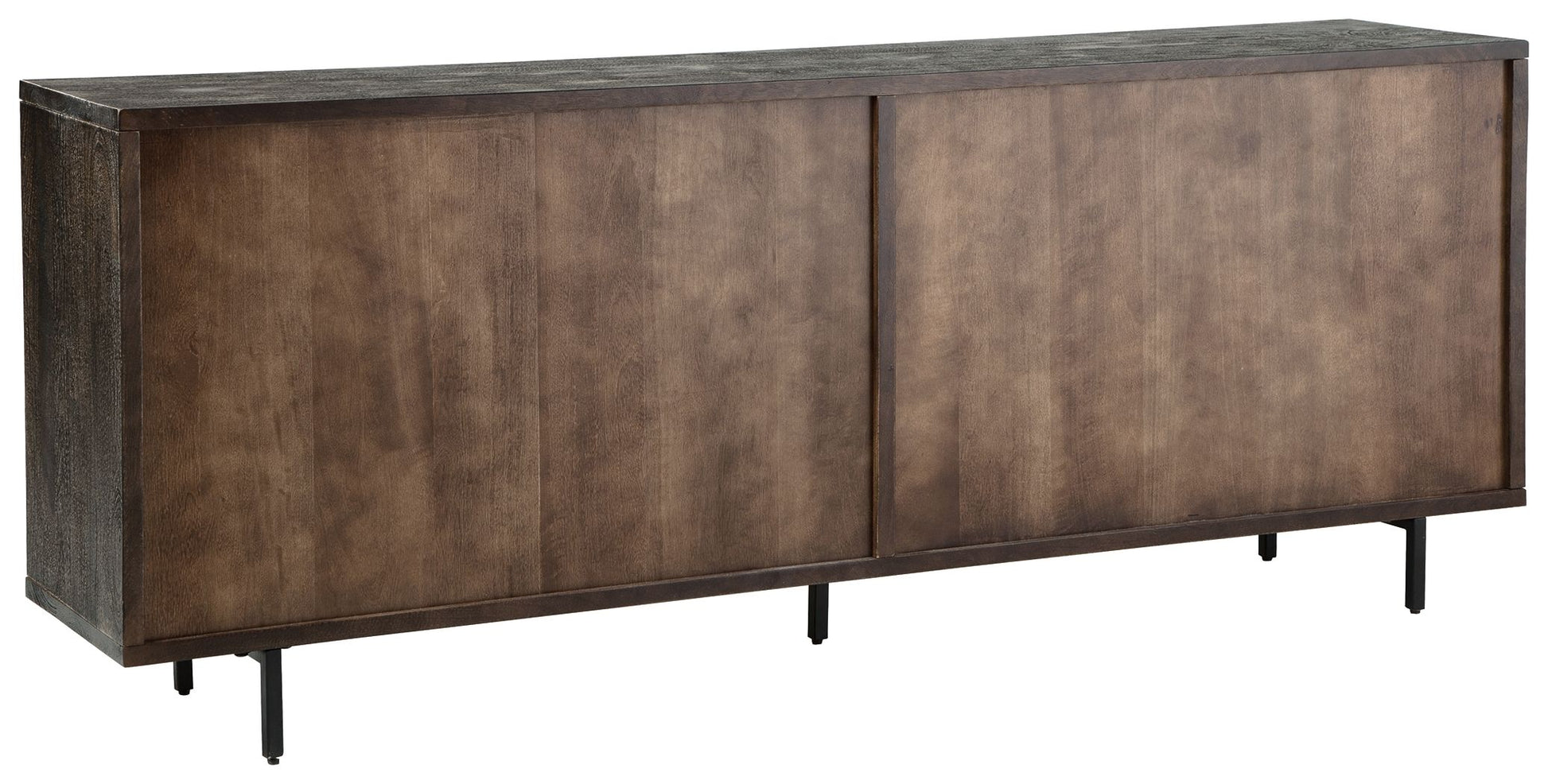 Elevate your contemporary home to a haven with an undeniably artistic attitude. This accent cabinet has a forward-thinking flair, featuring a modern mosaic created by strips of wood in varying hues against a dark brown and metallic gray finish. Fashionable and functional, the detailed doors open to reveal two shelves to suit all your storage needs.