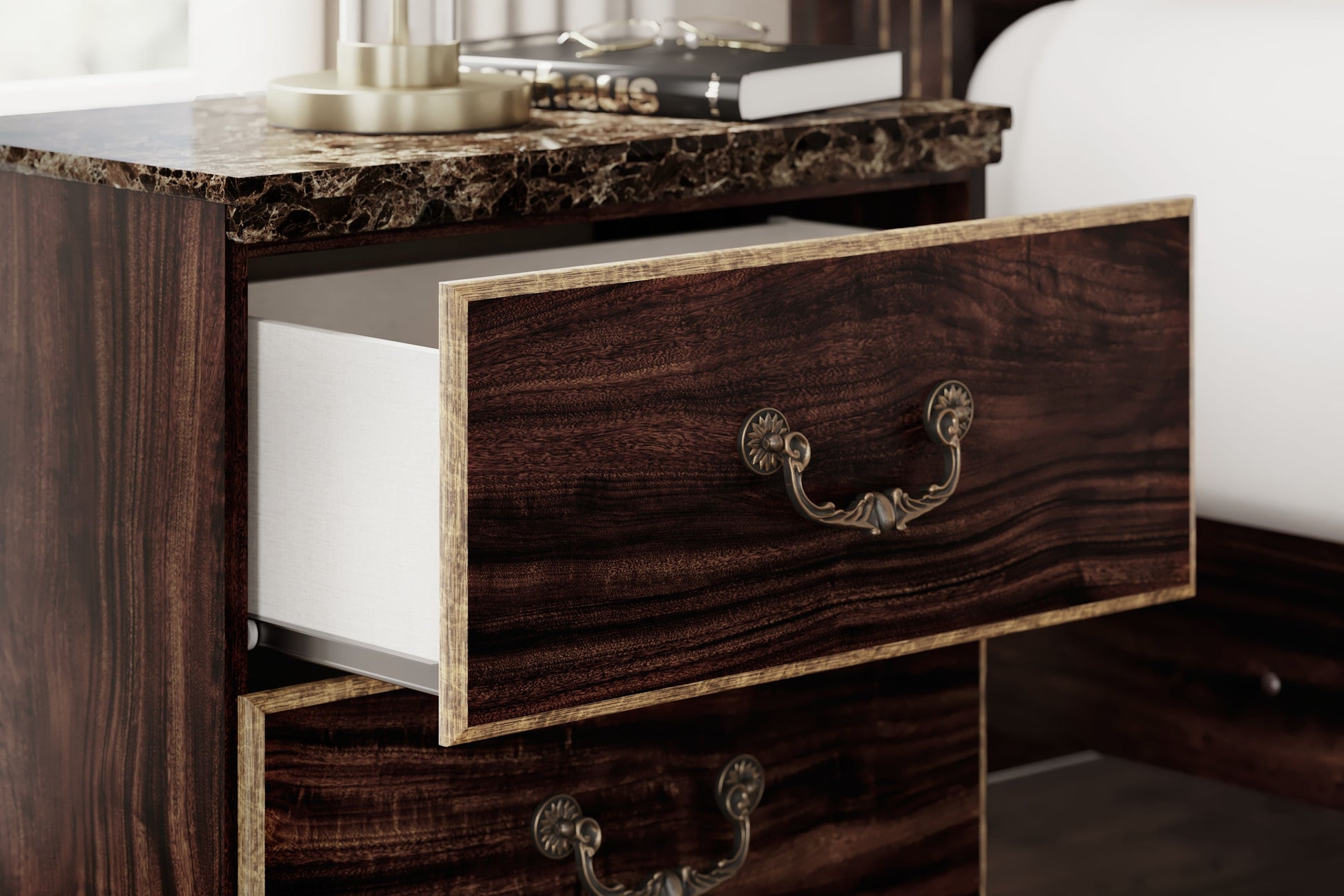 Timeless and classic, this nightstand offers a grand design accented with rich hues and eye-catching details. Stately from every angle, its sophisticated elements blend together to display your love of the traditional aesthetic. A slim USB port makes charging your electronics simple and easy.
