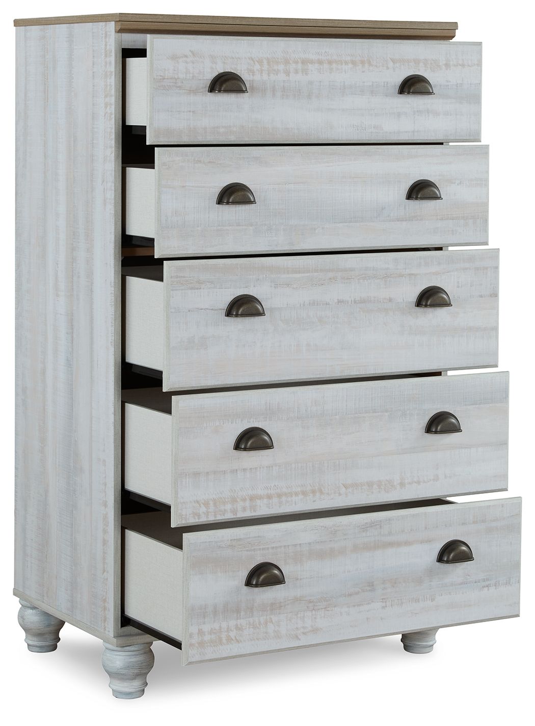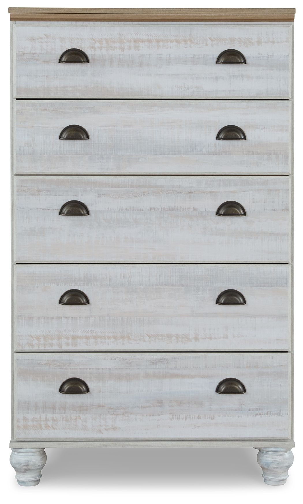 Beautifully simple yet rich with character, this chest of drawers is a dream come true. It masters the art of simplicity with a charming two-tone look of weathered white complemented by a replicated oak grain. Five spacious drawers provide plenty of room for folded clothes and fashion accessories. Bun feet add a distinctive look, while dark bronze-tone hardware is a brilliant finishing touch. If farmhouse style is calling your name, answer with this timeless treasure.