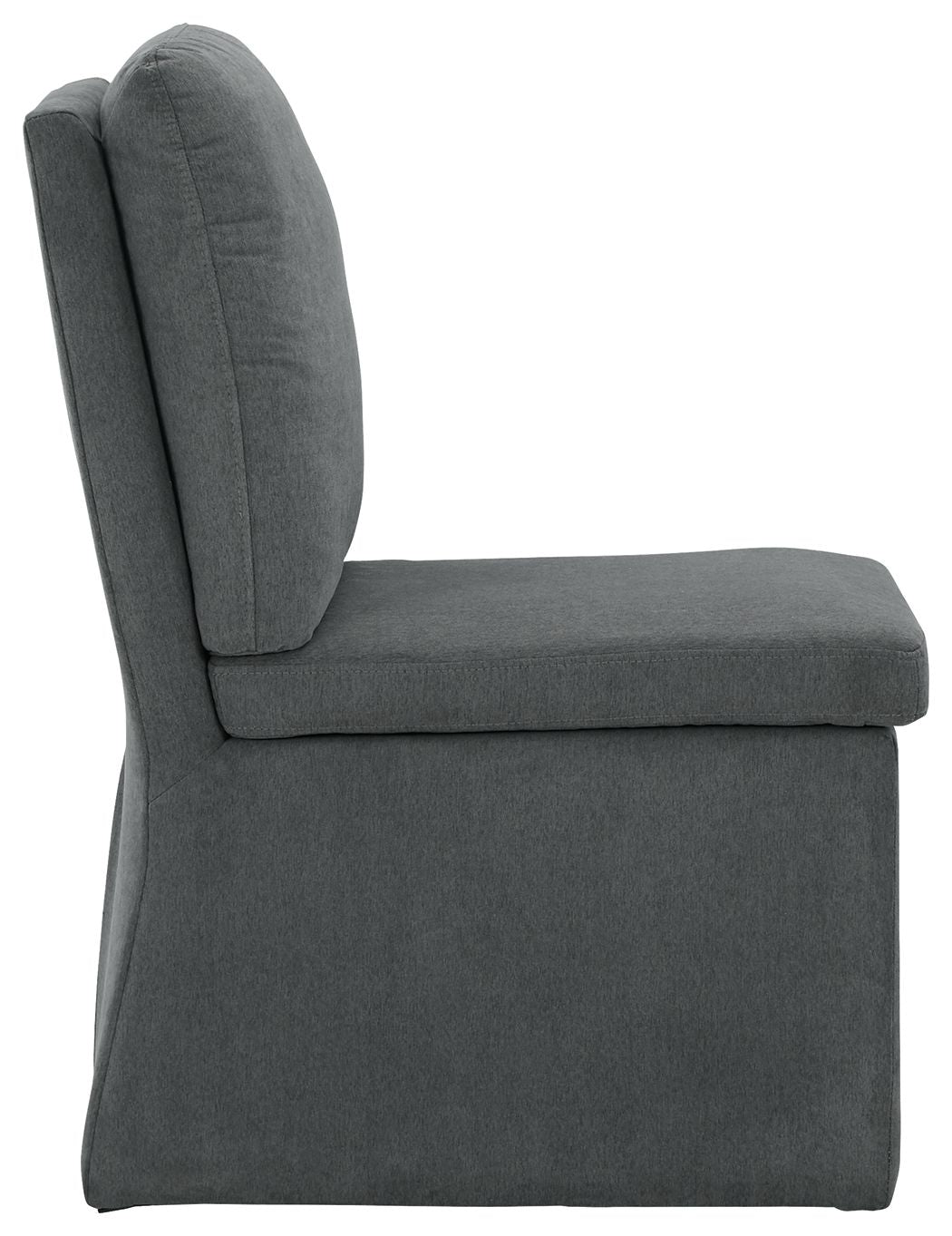 Enjoy home-cooked meals in style on this urban contemporary dining chair. Add it to a dining table or use as extra seating for impromptu entertaining. Covered in a warm woven polyester fabric with a comfortably cushioned seat and back, this chair features a fully upholstered skirt, a pleated back and casters for easy mobility. It’s designed for modern tastes with an urban vibe.