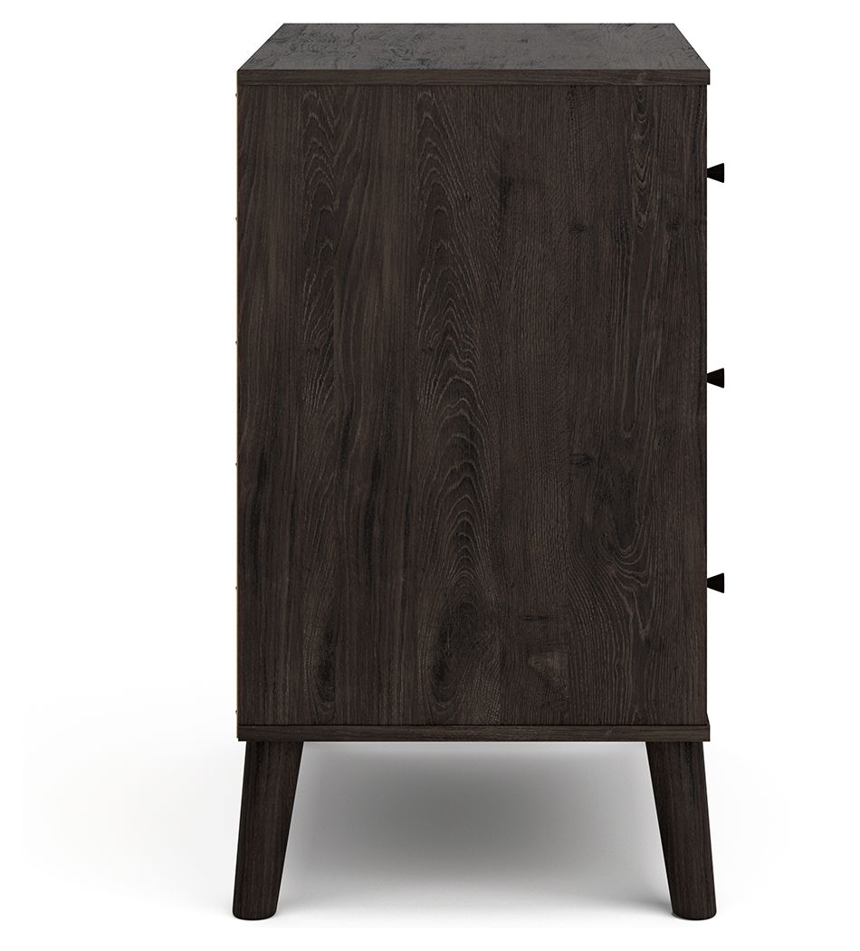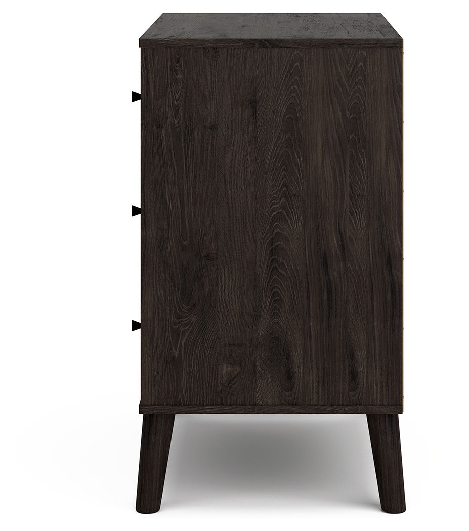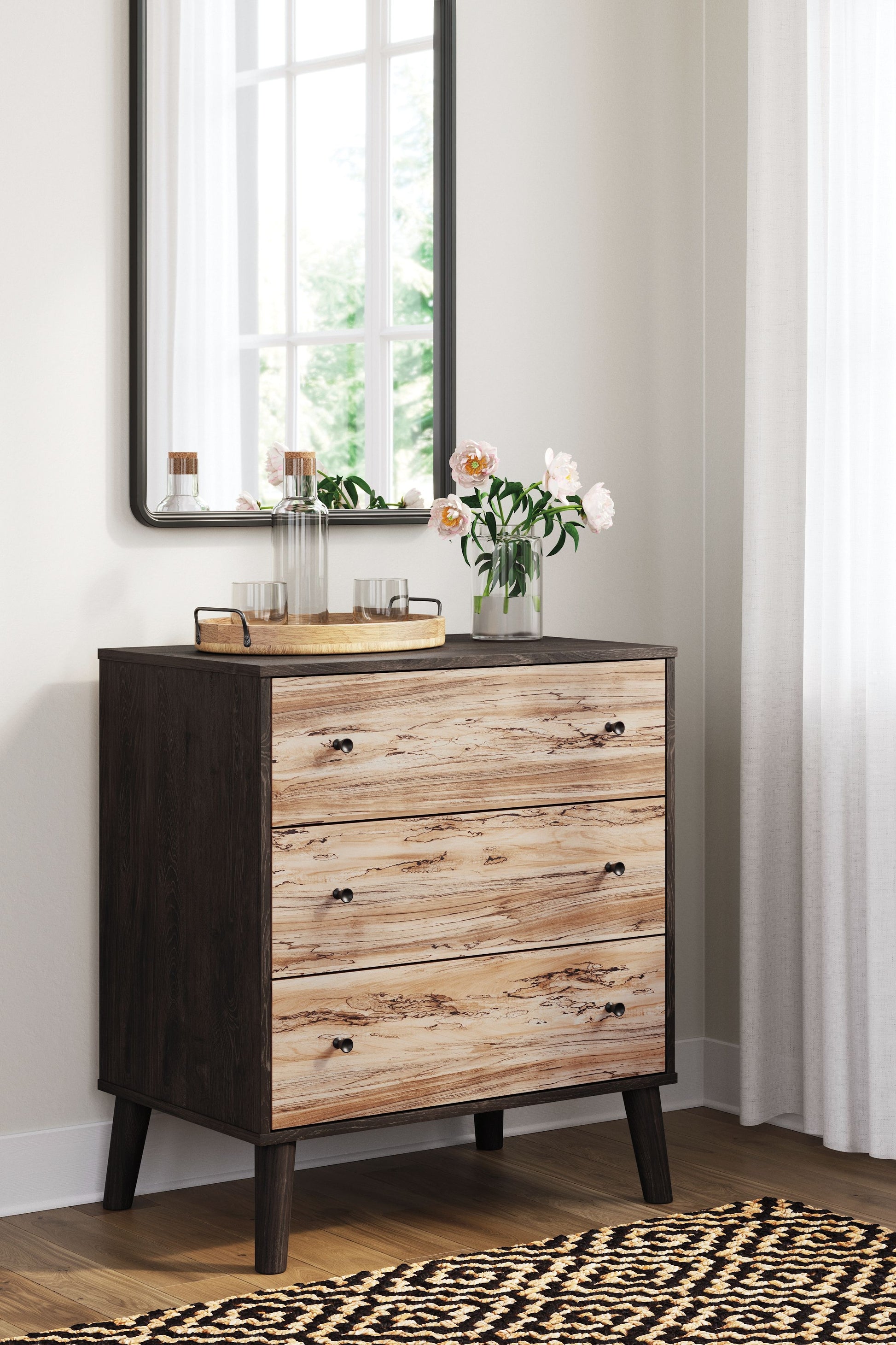 The perfect marriage of simple and contemporary style, this chest of drawers is a charming addition to your home. Effortless in its beauty, it sports an expressive two-tone look with a dark charcoal finish and replicated sugarberry wood grain. Ball-bearing glides offer smooth opening and closing of the drawers, while matte black knobs add a finishing touch.