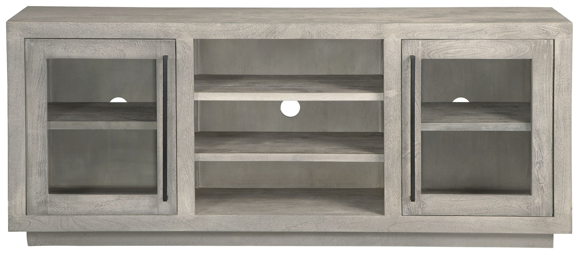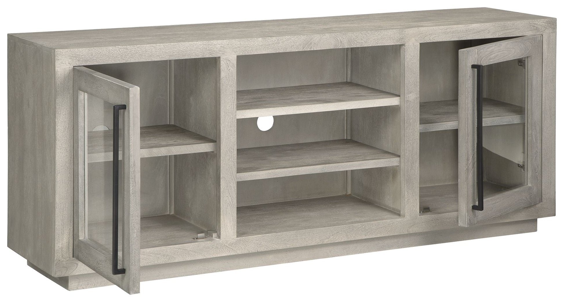This accent cabinet is a stoic piece with a sense of casual luxury. It has a sculptural feel with a hand-applied gray wash finish, while dark gunmetal door pulls add a hint of relaxed refinement. Whether you use it for display or storage, this cabinet elevates your space with contemporary style in a snap.