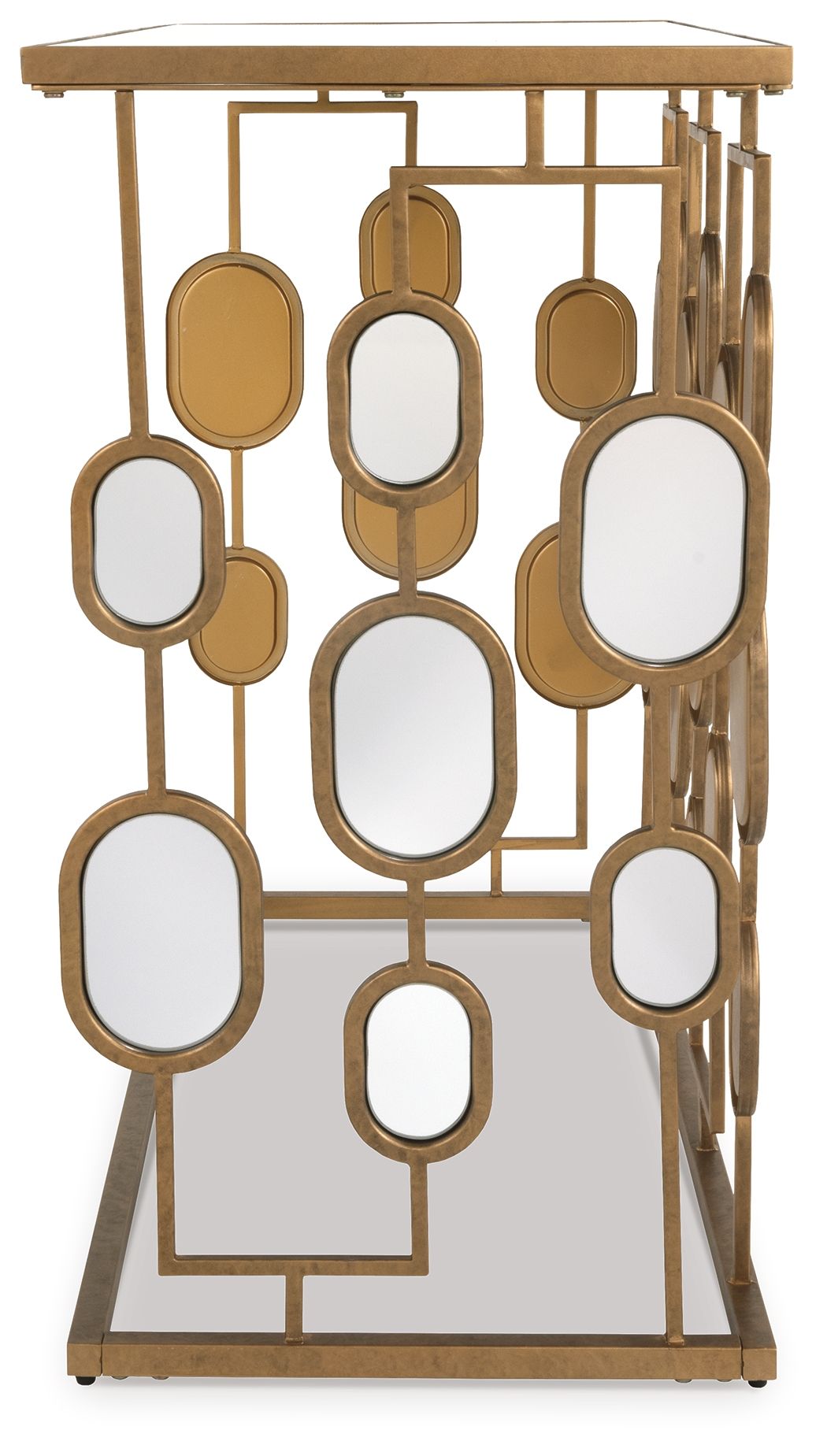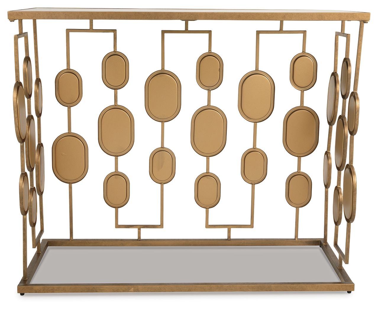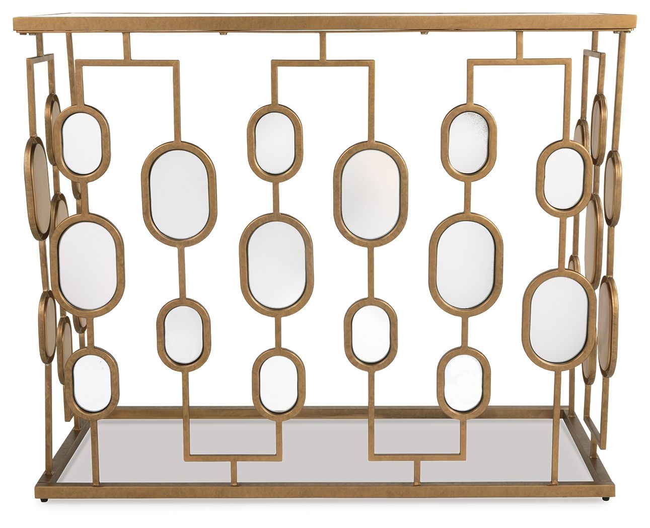 Let your sense of high design shine with this console table. Mirrored glass and a luminous goldtone finish make luxury a part of everyday living. Minimalist-chic styling is sure to open up a space beautifully.