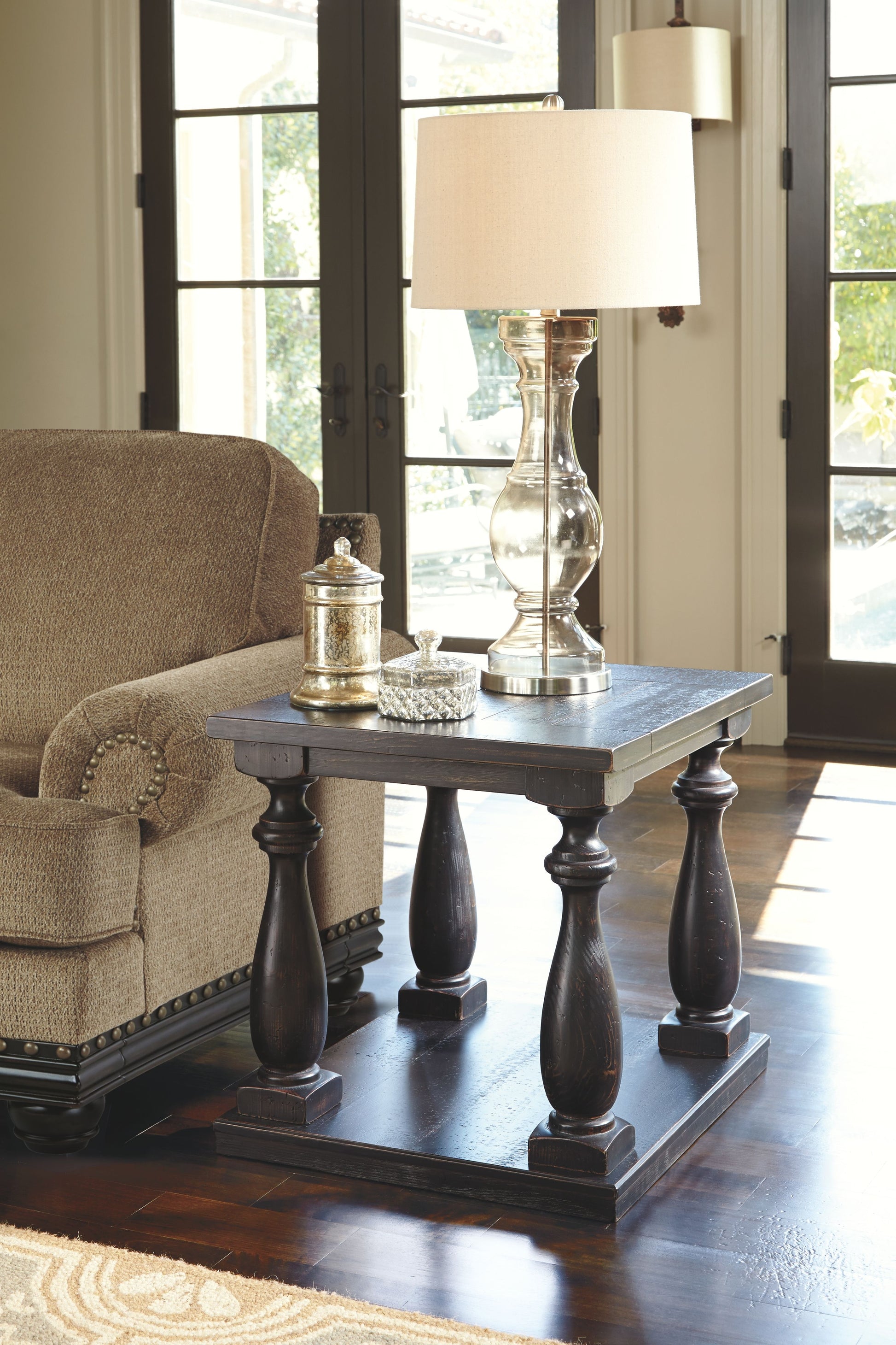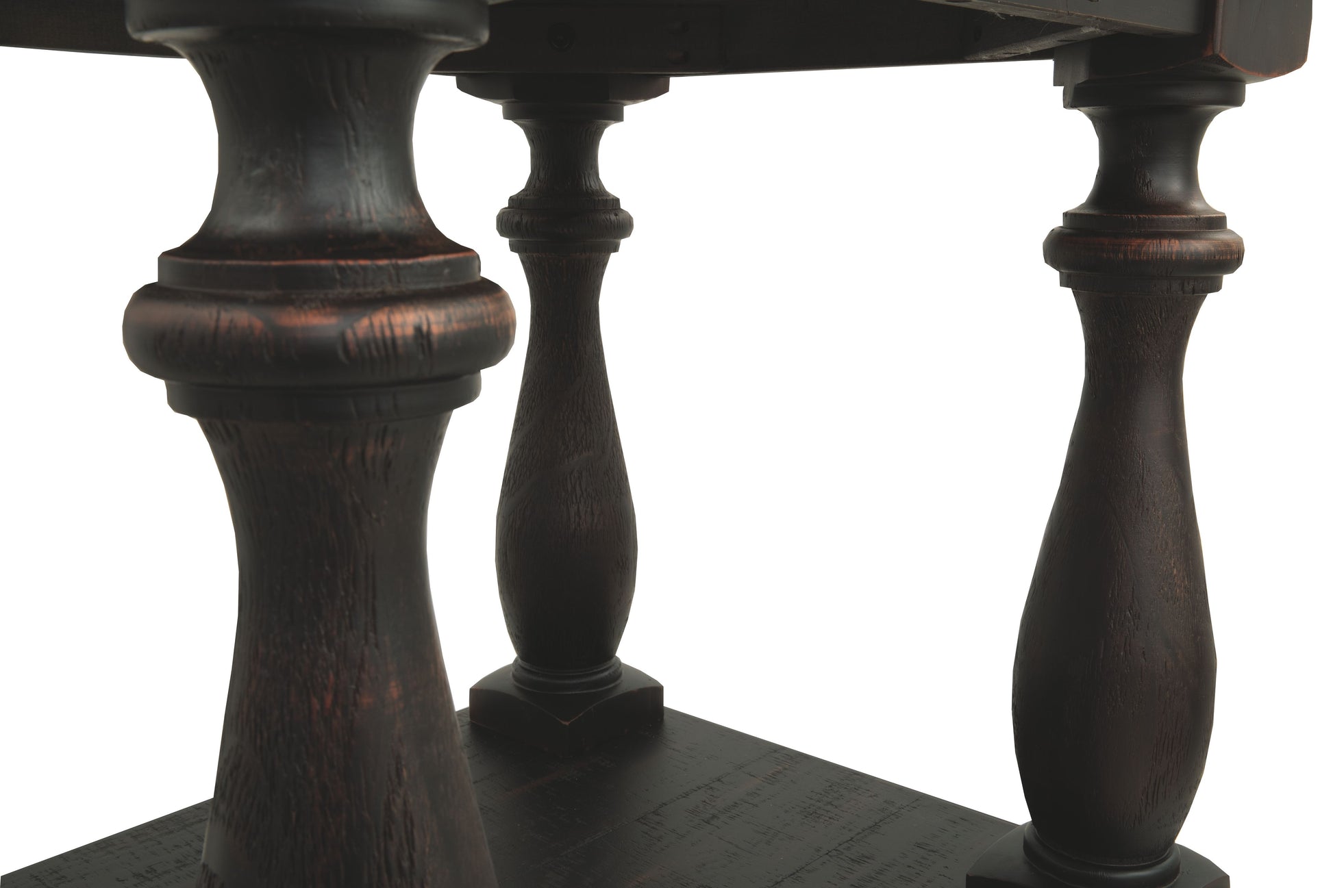 This black end table has a dramatic presence—exactly what an eclectically styled room needs. Solid wood planks and thick veneer merge seamlessly together for a hearty helping of style. Handsomely turned legs connect to a lower shelf flush with the floor. A rustic wirebrush technique gives this stunning square end table in black with show-through contrasting just enough of a weathered sensibility.