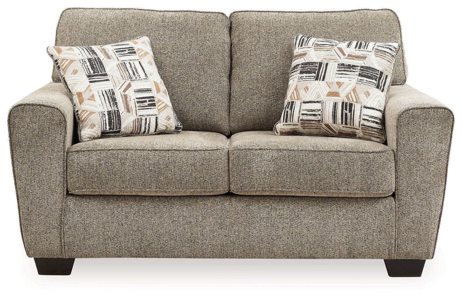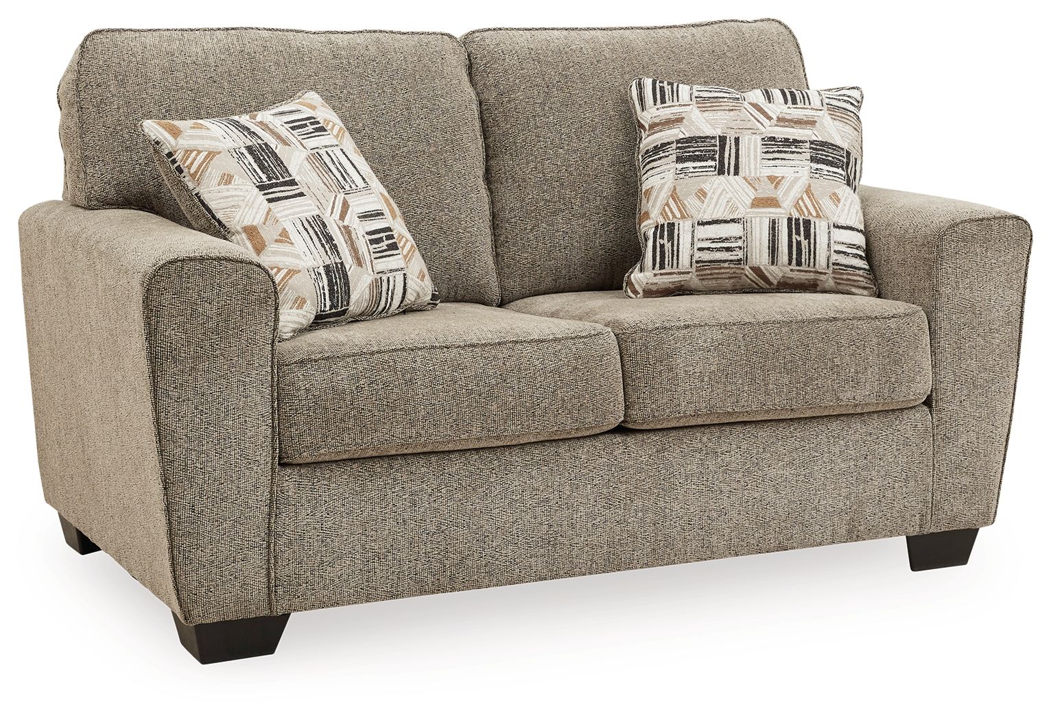 For seating that feels as good as it looks, the choice is clear. This loveseat has a neutral mocha hue that blends effortlessly with any room decor and color scheme. Its soft textured chenille fabric with chevron effect beckons you to sit and relax. Wide track arms elevate the look with a touch of contemporary sensibility, enticing you to settle in and stay awhile. Caramel and black toss pillows are a designer favorite.