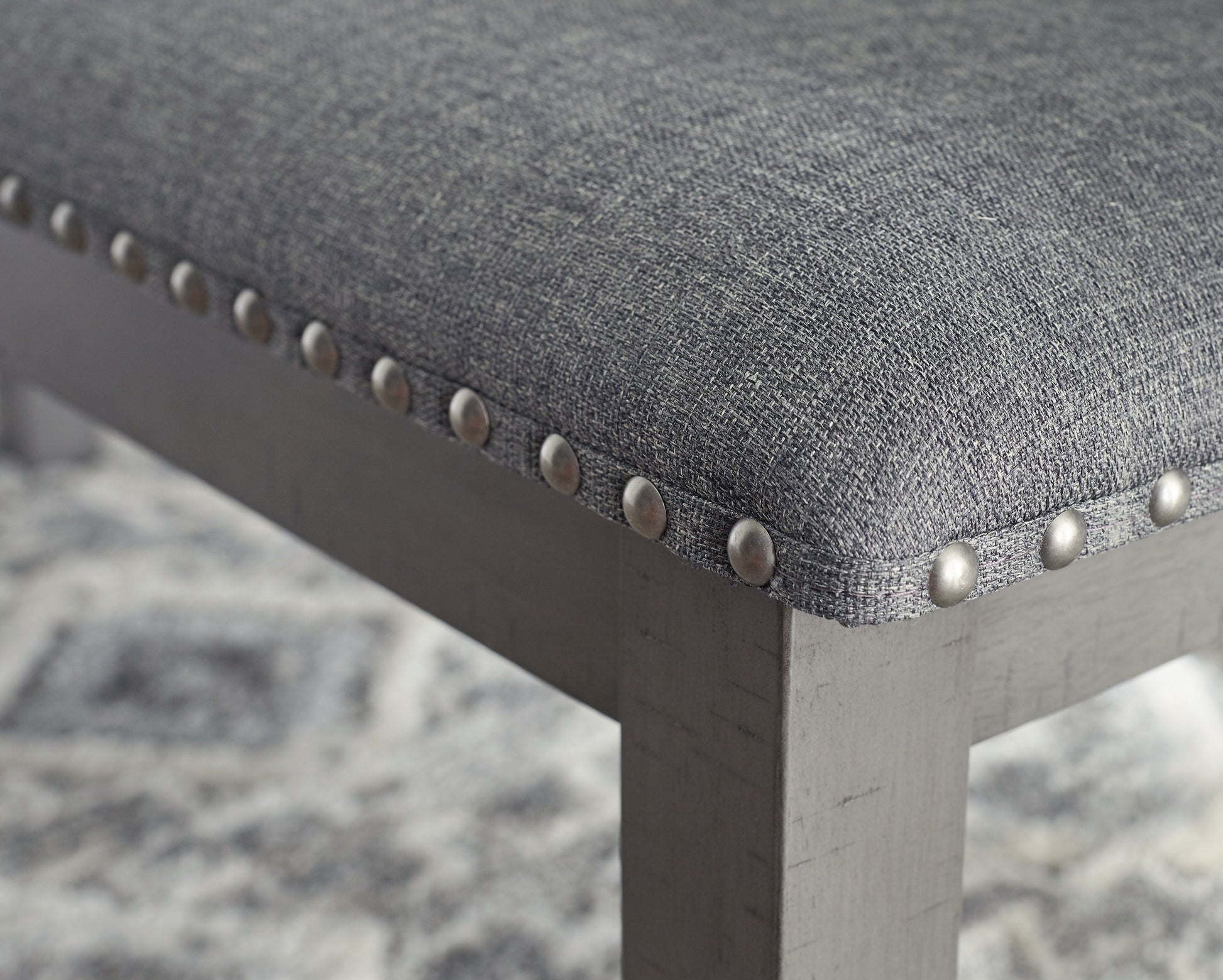 Going gray in the best possible way. This dining bench wows with an utterly on-trend smoky gray finish. Its softly cushioned seat with gray textured upholstery and nailhead trim will have you lingering a little longer at mealtime. Just a touch of distressing helps it fit right in with your modern farmhouse decor.