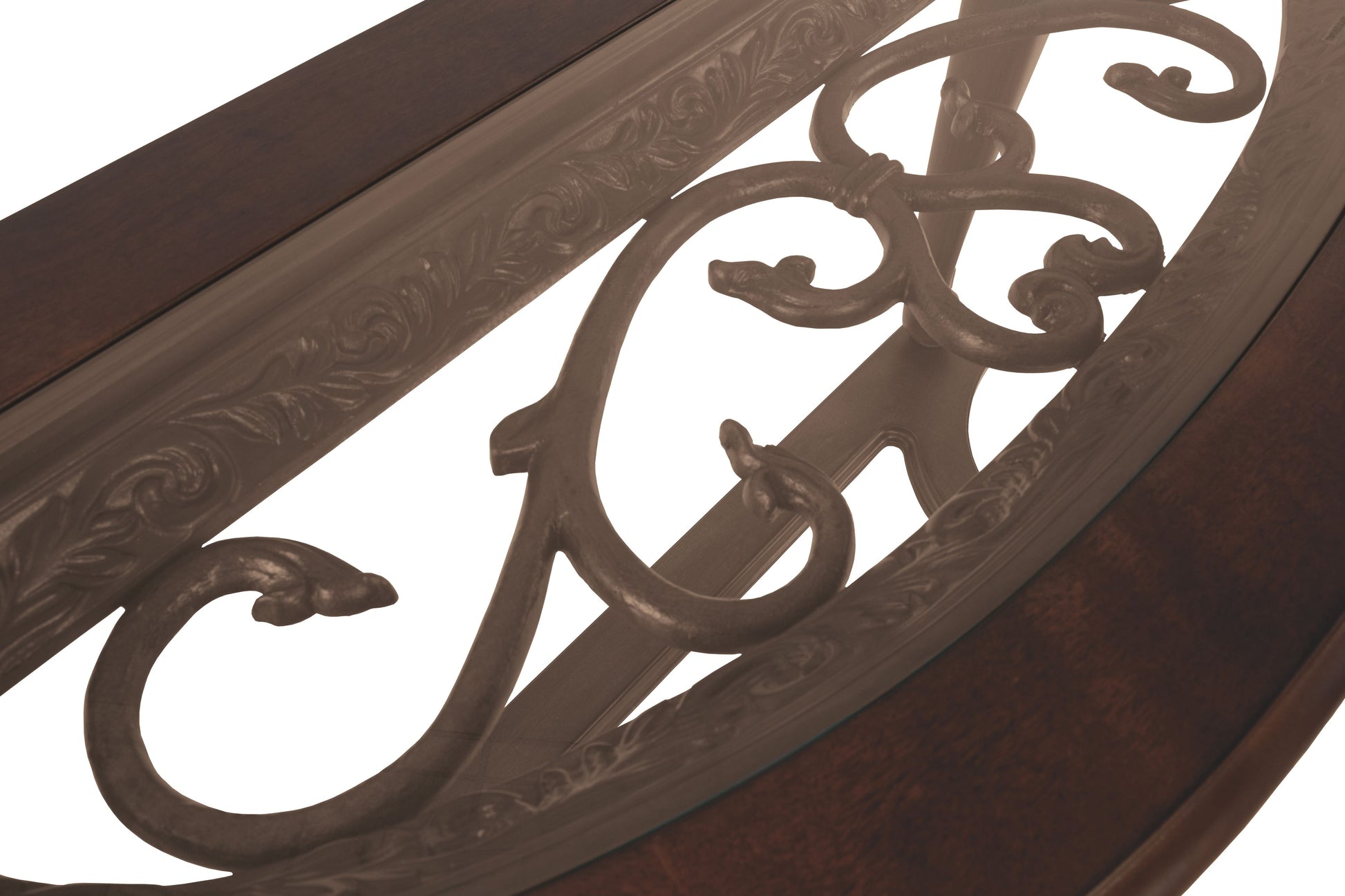 - Beveled glass top with scrollwork underlay
