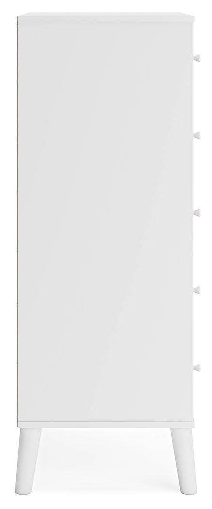 The perfect marriage of contemporary and casual style, this chest of drawers is a charming addition to your home. It's expressive with a two-tone look in a solid matte white finish and a replicated sugarberry wood grain pattern. Ball-bearing glides offer smooth opening and closing of the drawers, while white knobs and splay legs add a finishing touch.