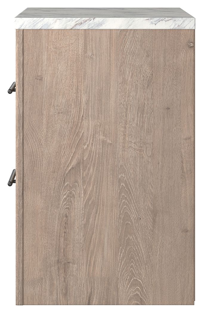 Cool, clean and casually modern. This nightstand’s light natural finish and faux Calcutta marble top set the tone for your calming sanctuary. Large linear pulls add dimension and authenticity. Two smooth-gliding drawers neatly accommodate your bedside needs.