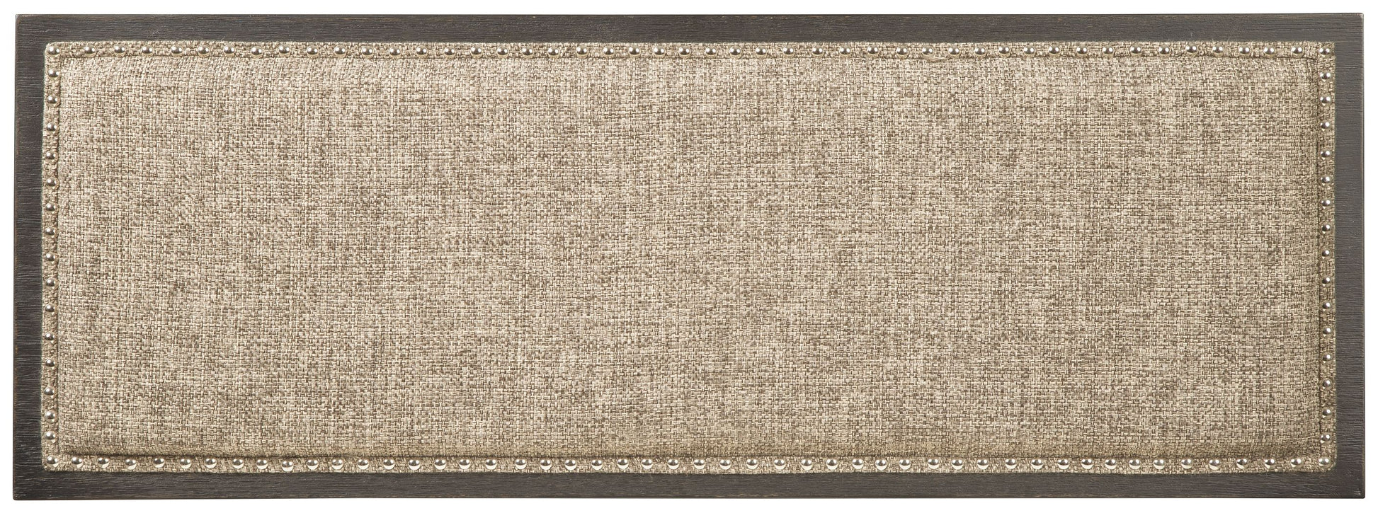 Invite your family into the heart of your home with this upholstered dining room bench. Tapered legs are a sturdy foundation, while the counter-height design raises the bar on fine dining. Textured black finish and heavy woven neutral upholstery accented with silvertone nailhead trim is trend-right urban farmhouse style without all the fuss.