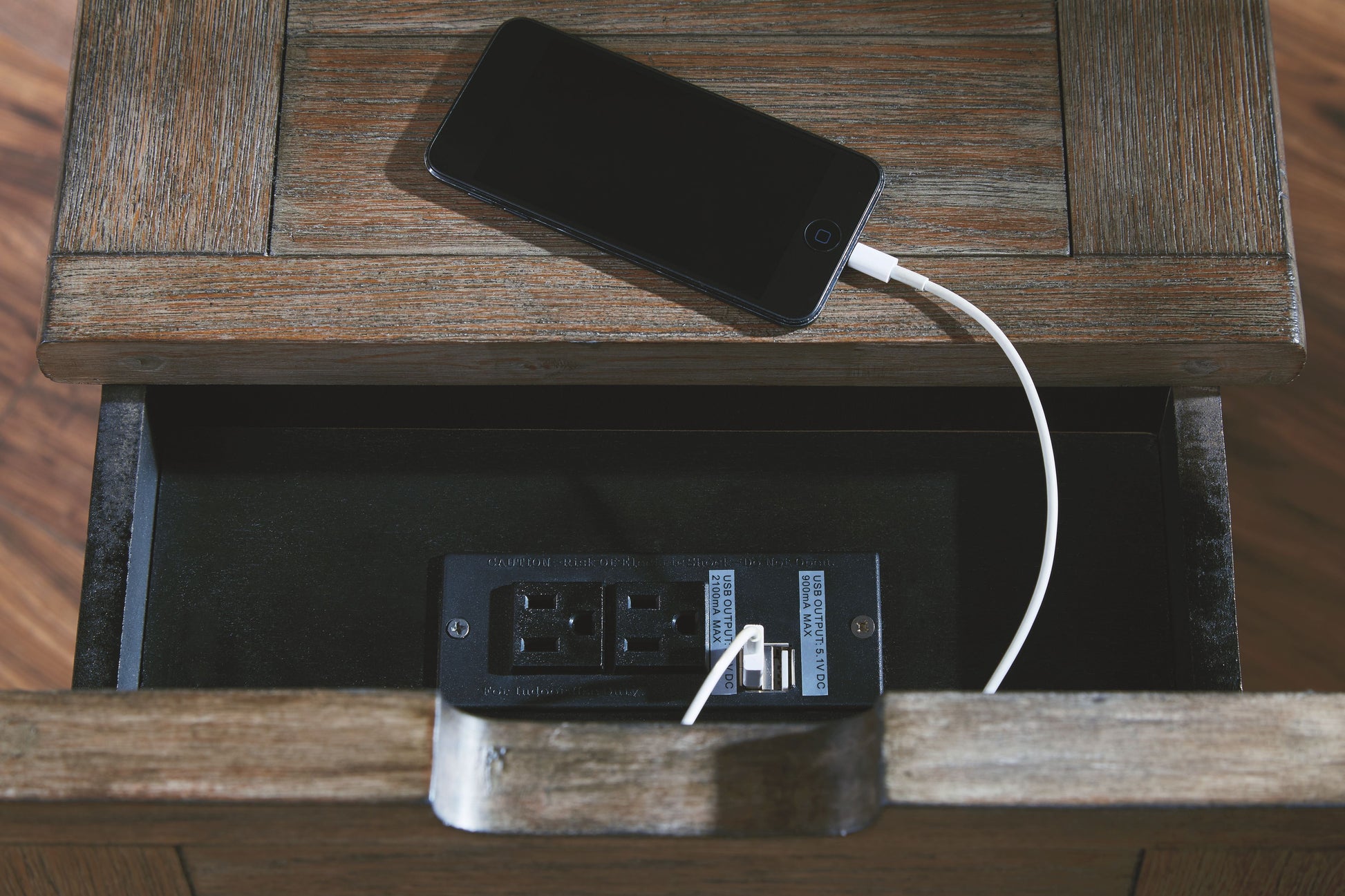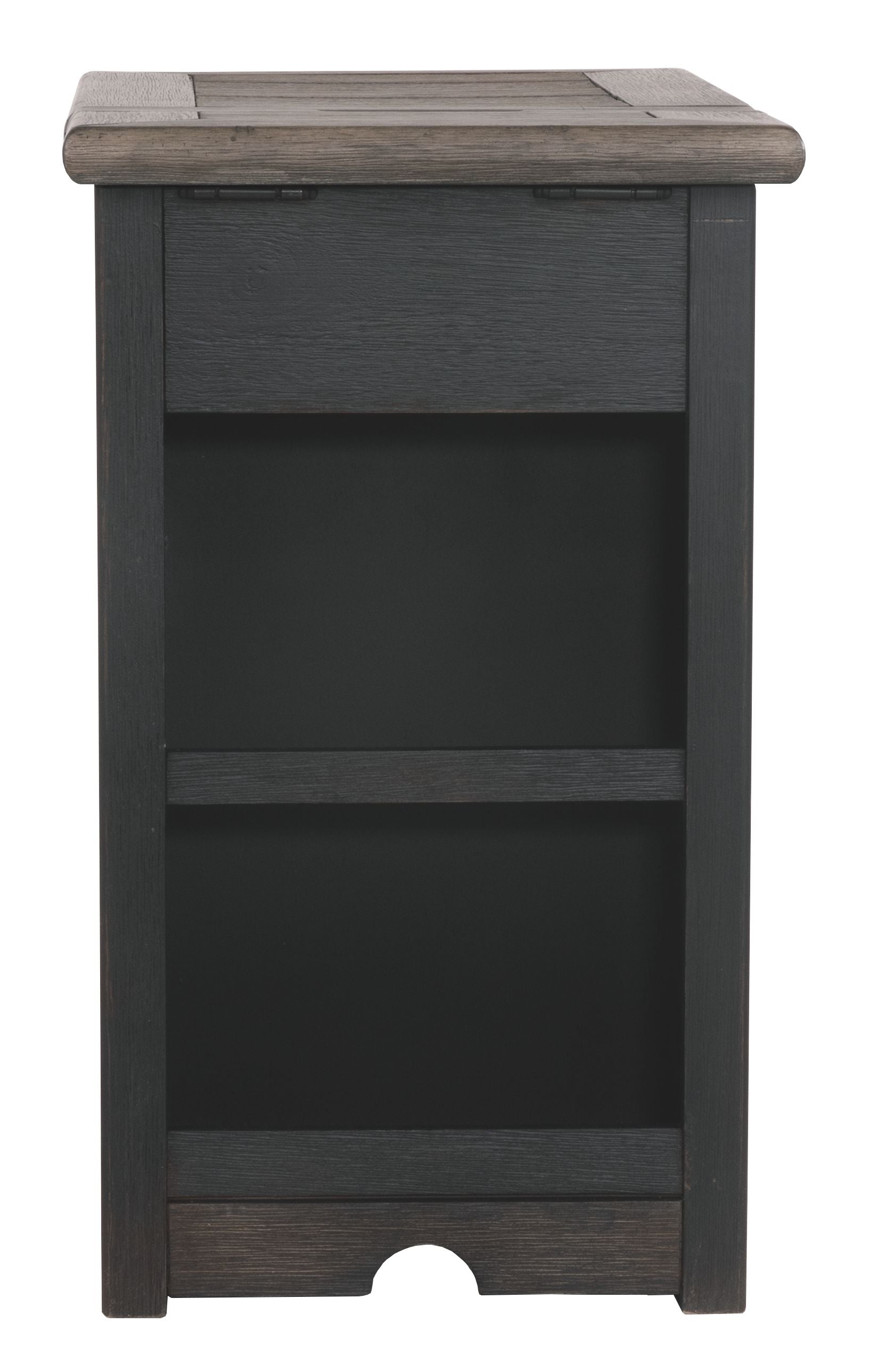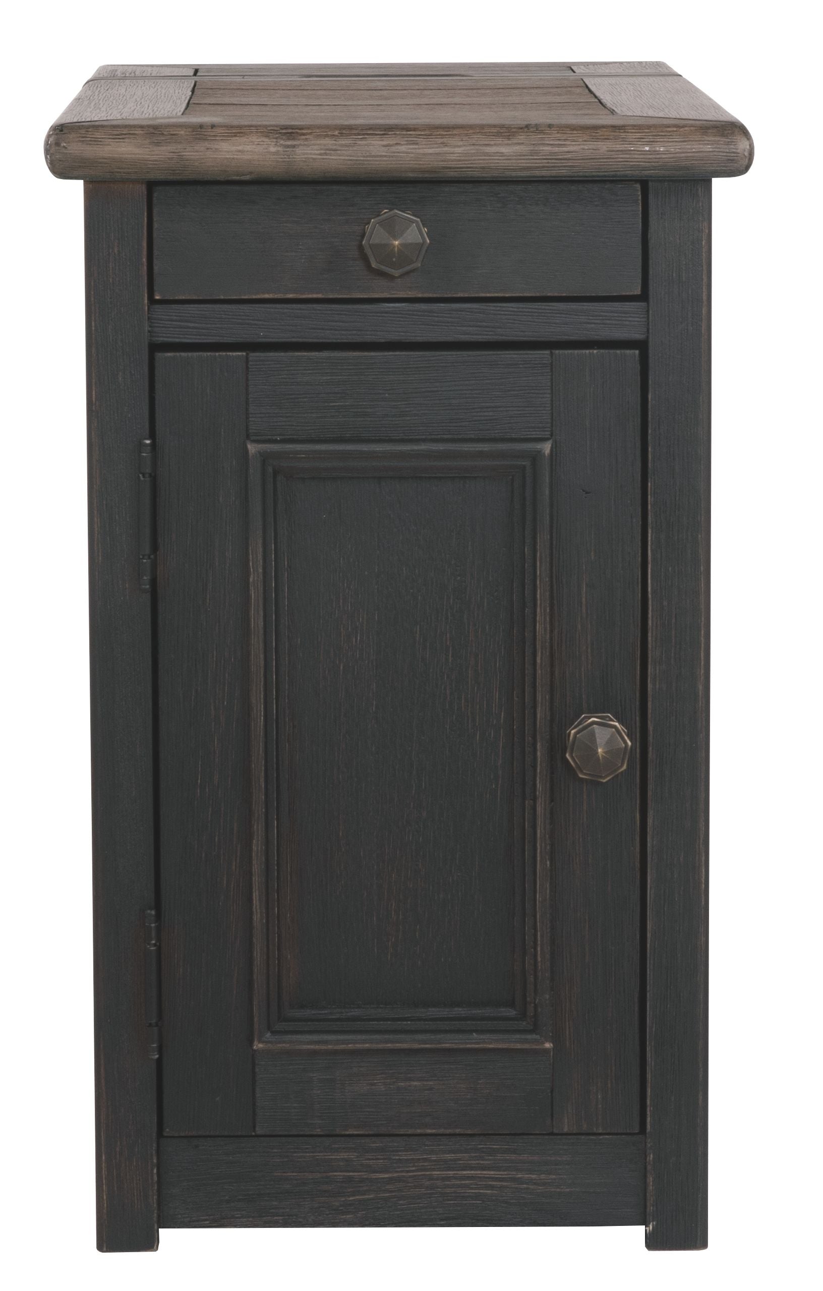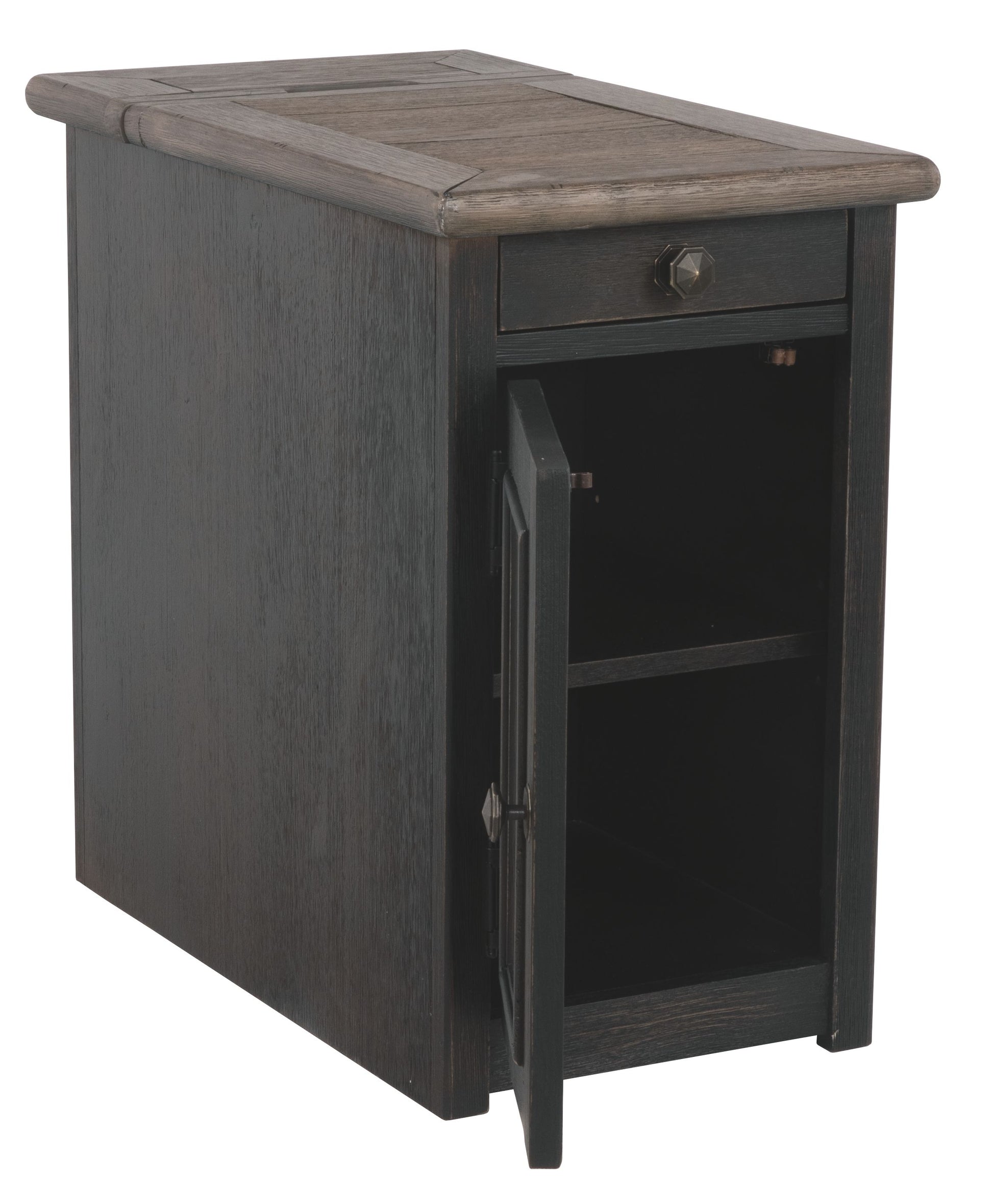 Shabby chic with a hint of down home country. This chairside end table with textured black finish is all the talk of today’s design world. Wood grain shows through the weathered gray-brown top in all of its earthy pleasure. Pull-out tray with lovely traditional hardware has two cup holders. Fuel up your devices with the convenient charging station.