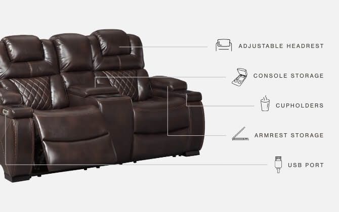 Your modern living room awaits with this power dual-sided reclining loveseat. Complete with practical faux leather upholstery, one-touch power controls, adjustable headrests and USB ports, it makes finding the best seat in the house a breeze. Cup holders and a storage console keep drinks, snacks and remotes close by. Go ahead—treat yourself to a high-design home theater experience, priced to put you at ease.